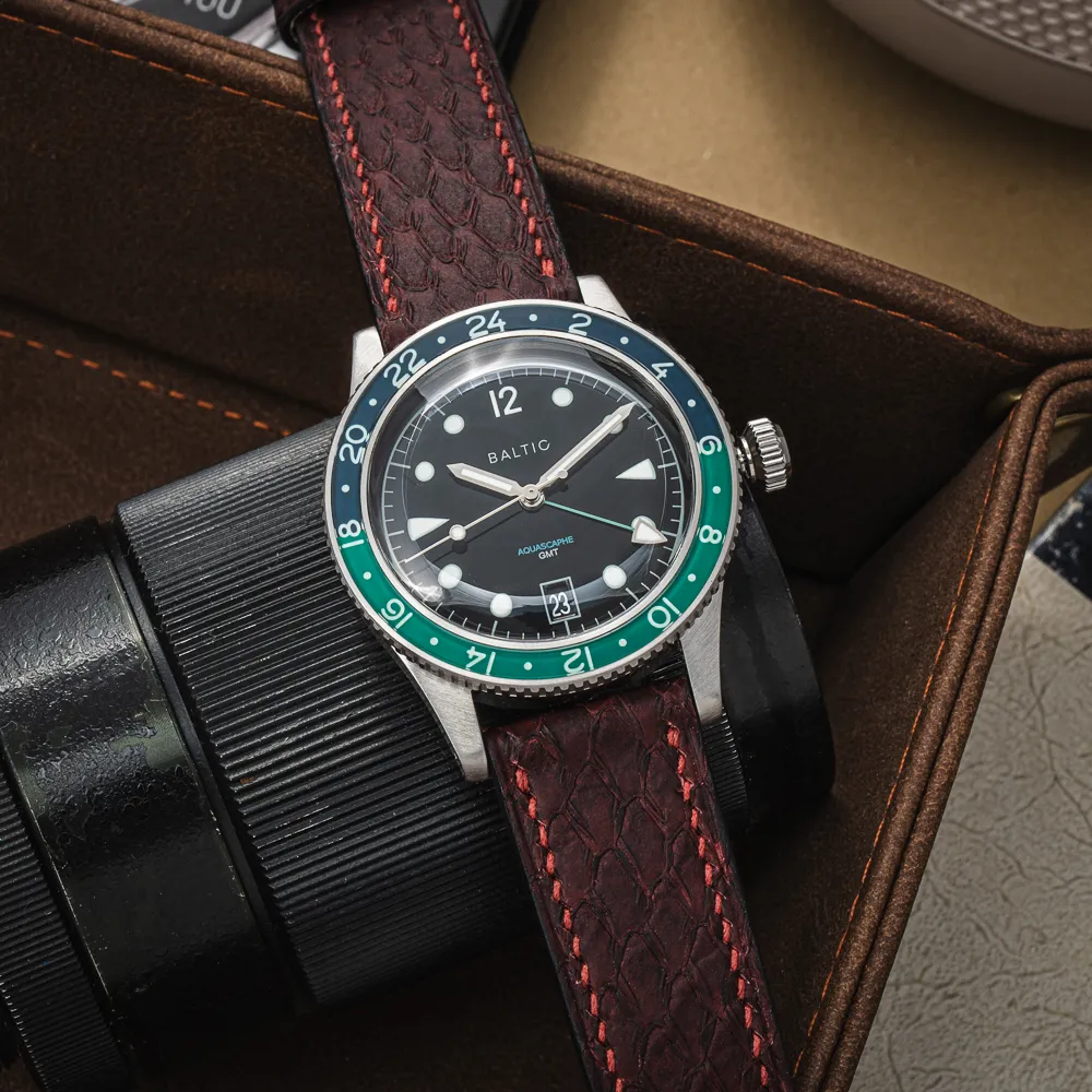 Pasek Salmon Satin Red Wine/Burgundy wykonałem z niecodziennego materiału, jakim jest skóra z łososia. Mimo swojej niewielkiej grubości posiada świetną wytrzymałość na rozciąganie. Skóra ze swoją łuskowatą fakturą zdecydowanie potrafi przyciągać wzrok. Spód paska podszyłem czarną, kozią skórą utrzymując cały pasek w ciemnych odcieniach. Jest to pasek do zegarka dla osób lubiących odrobinę ekstrawagancji, połączonej z klasycznym burgundowym kolorem.