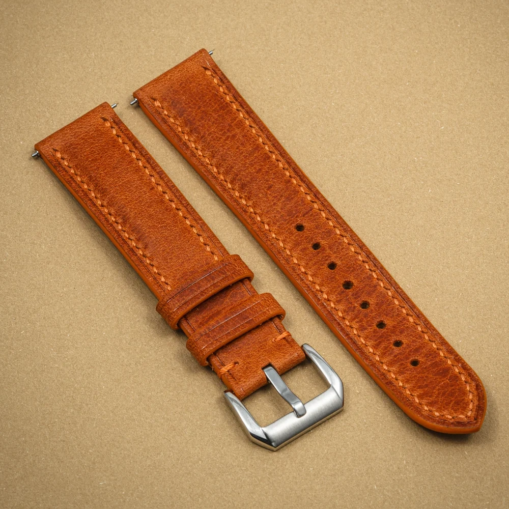 Skóra z biegiem czasu nabiera patyny, podkreśli to kolor i charakter materiału. Lico skóry jest gładkie i bardzo przyjemne w dotyku. Pasek Tempesti Baku Fieno/Orange jest elastyczny, przez co świetnie układa się na nadgarstku od pierwszych chwil noszenia. Rudo-pomarańczowy kolor z pomarańczową nicią, wyróżni zdecydowanie zegarek na nadgarstku.