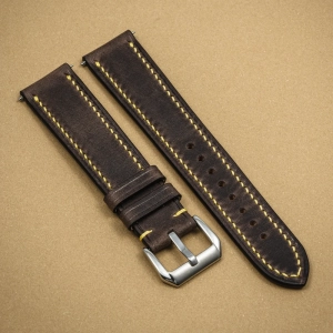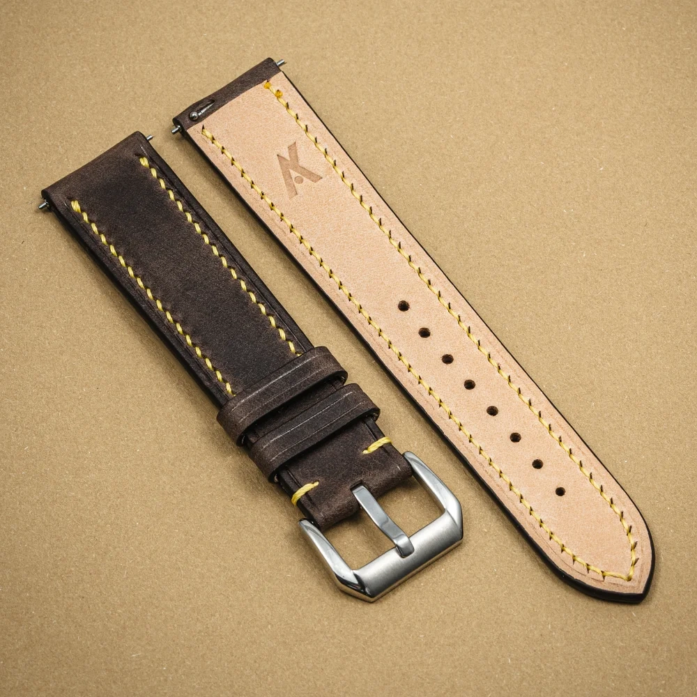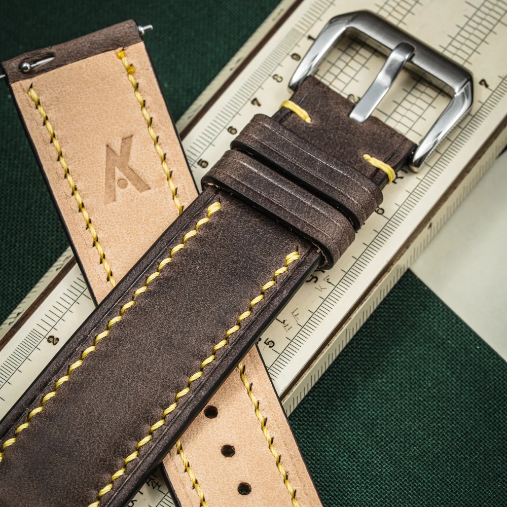 Skóra z biegiem czasu nabiera patyny, podkreśli to kolor i charakter materiału. Lico skóry jest gładkie i bardzo przyjemne w dotyku. Pasek Tempesti Baku Grey/Yellow jest elastyczny przez co świetnie układa się na nadgarstku od pierwszych chwil noszenia. Klasyczny brązowy kolor przełamałem żółtą nicią, aby nadać odrobinę świeżości i podkreślić ewentualne elementy zegarka. Doskonały wybór dla osób, które szukają klasycznego koloru z drobną nutą szaleństwa.