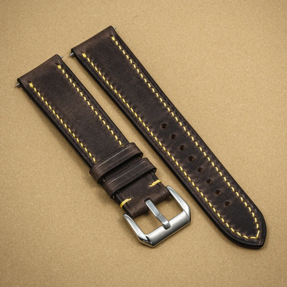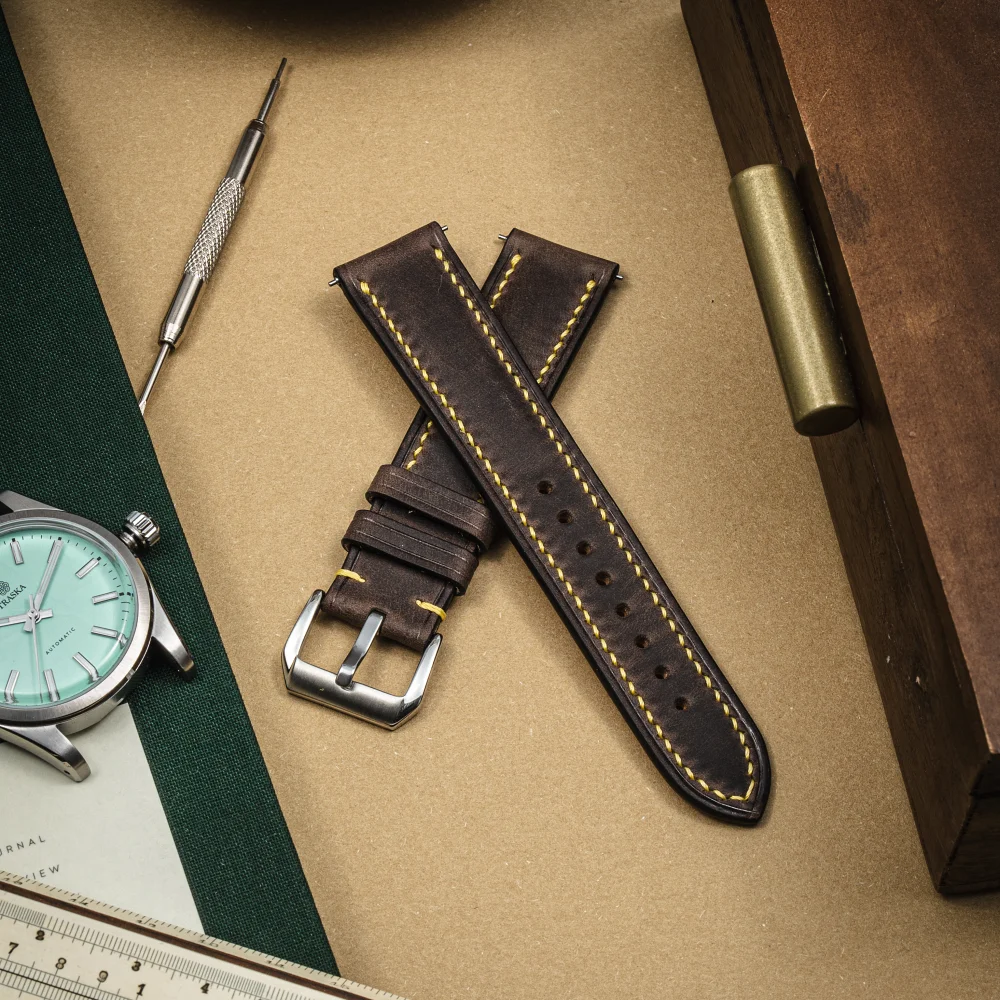 Skóra z biegiem czasu nabiera patyny, podkreśli to kolor i charakter materiału. Lico skóry jest gładkie i bardzo przyjemne w dotyku. Pasek Tempesti Baku Grey/Yellow jest elastyczny, przez co świetnie układa się na nadgarstku od pierwszych chwil noszenia. Klasyczny brązowy kolor przełamałem żółtą nicią, aby nadać odrobinę świeżości i podkreślić ewentualne elementy zegarka. Doskonały wybór dla osób, które szukają klasycznego koloru z drobną nutą szaleństwa.